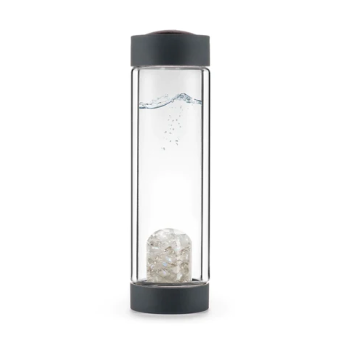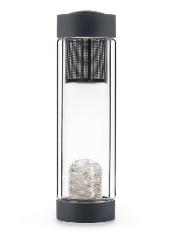 This Crystal Infusion Bottle with genuine gems features lab-quality, double-walled glass for insulation. Your guests can enjoy the sparkle of their favorite gemstone blend inside the bottle while brewing tea on-the-go with the extra-large tea strainer (sold separately). The bottle stays cool to the touch while offering crystal vibes for hot or cool drinks. Engineered in the German Alps. Made in Germany. Bottle holds 12.2 fl. oz.